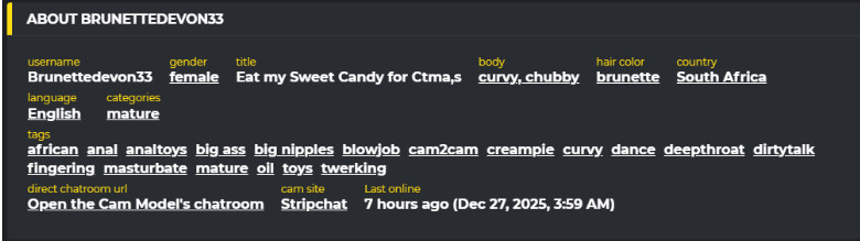 Known for sensual and mature conversations, Brunettedevon33 brings with her a sensual appeal. Coming from South Africa, Brunettedevon33’s shows put emphasis on connection via Cam2Cam session, Lovense toy control and dirty talking.