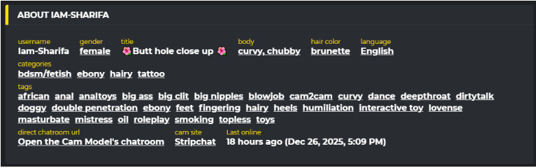 With tags like ebony, big ass, mistress, roleplay, etc., Iam-Sharifa on Lemoncams caters to a variety of audience desires. Being an African performer, who is charismatic, she builds a powerful connection with her audience. With it all, she ensures all her viewers feel like they are part of the action.