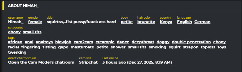 Hailing right from Kenya, Nimah_ is an energetic spirit. She brings her energy to all her streams on Lemoncams. As a fan of orgasm-driven shows that are quite intense, her tags highlight specialities like fuckmachine, fisting and squirt.