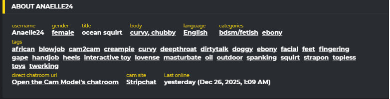 Anaelle24 is a popular Lemoncams performer who hails from Lesotho. She offers a mix of explosive release and playful tease, with “squirt for daddy” being her calling card. Moreover, her love for spanking and her curves perfectly add excitement layers to her performances.