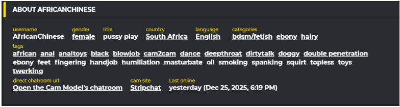 Called exotic by her fan following, AfricanChinese on Lemoncams stands out for her unique redhead attractiveness and her South African heritage. All her performances are dynamic and quite often feature double penetration and dance scenes.