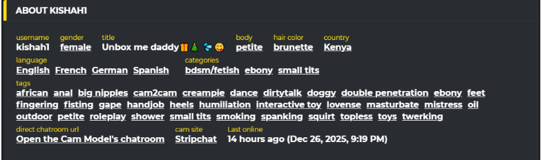 kishah1 is a Kenyan model who is called as a true performer. She is famous for her squirting shows, which, as described by them, are fountains. As for her daring sense of creativity, it makes all her Lemoncams streams special.