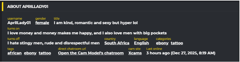 Hailing from South Africa, AprilLady01 is well-described as kind, hyper, romantic and sexy. It’s a combination that makes her streams thrilling and unpredictable. She is also openly motivated by her generous partners, who help her create a direct and transactional dynamic that many find to be exhilarating.