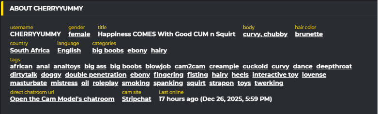 CHERRYYUMMY lives entirely up to her name, promising that happiness comes with a good cum n squirt. As a South African cam model, she is celebrated for her hairy and voluptuous figure, which she carries with pride. All her shows are like a feast for her senses, quite often involving orgasm control, strap-ons and intense roleplay scenarios.
